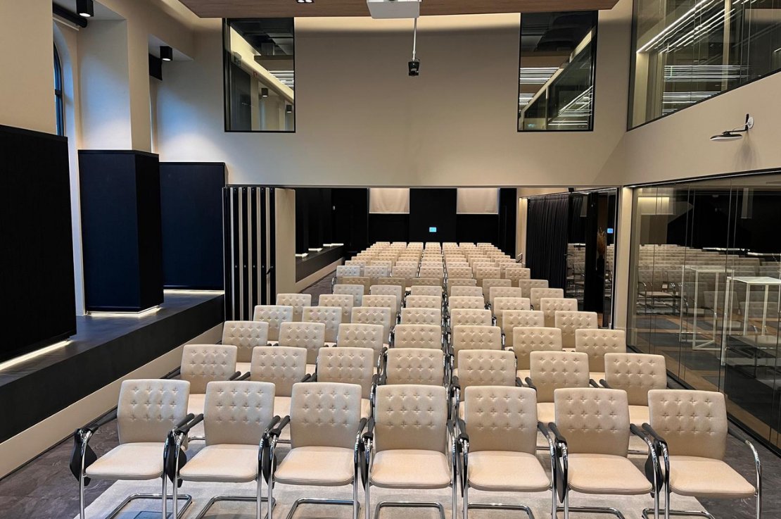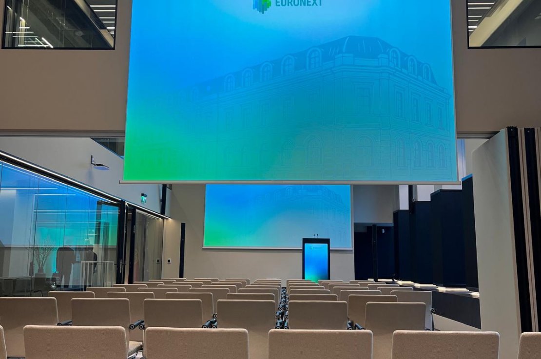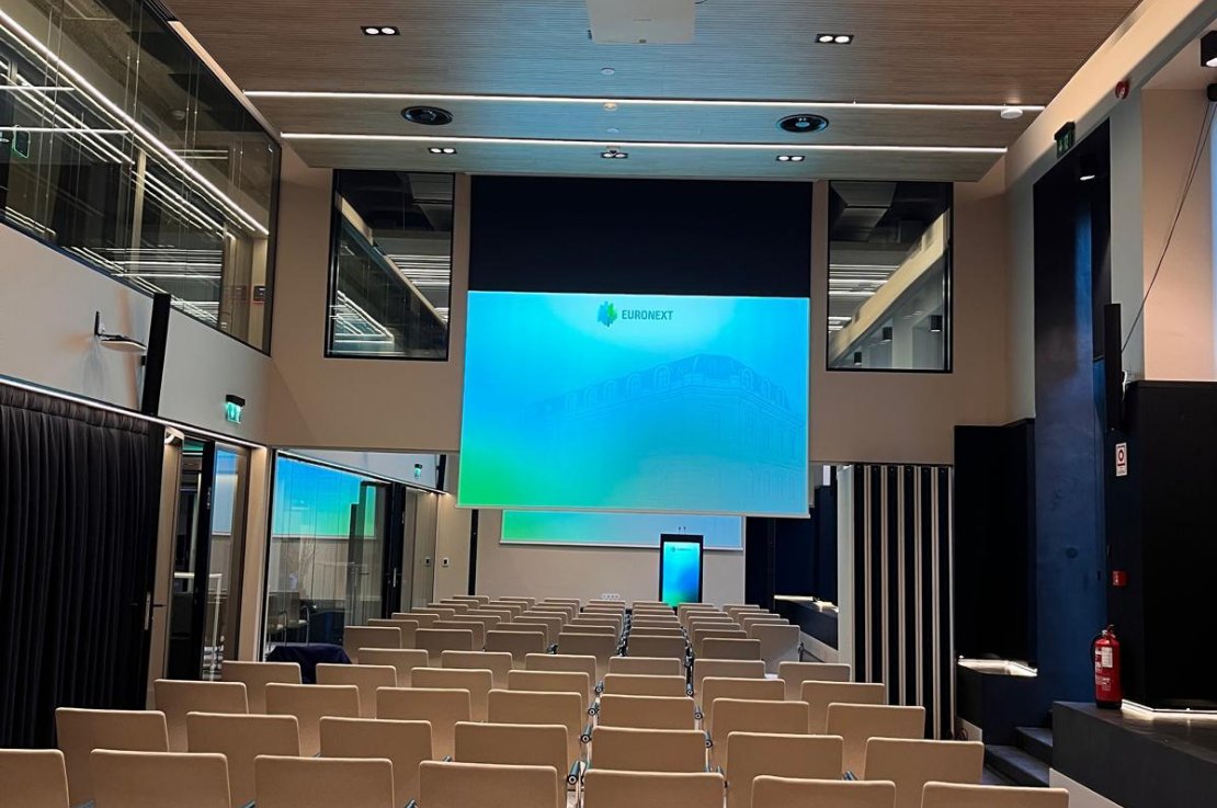Euronext Porto foram equipados com soluções completas de som, imagem e videoconferência. Os projetores de alta resolução, colunas e microfones garantem uma experiência imersiva e eficaz para apresentações, formações ou reuniões híbridas. O controlo dos sistemas é assegurado por