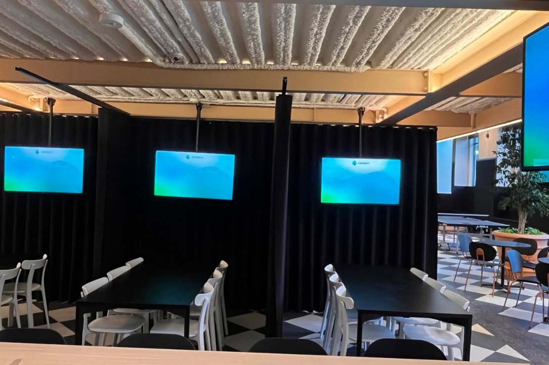 O espaço de convívio e restauração foi equipado com colunas distribuídas e monitores estrategicamente posicionados, permitindo a difusão de conteúdos de forma clara e envolvente. Toda a gestão é feita através do mesmo